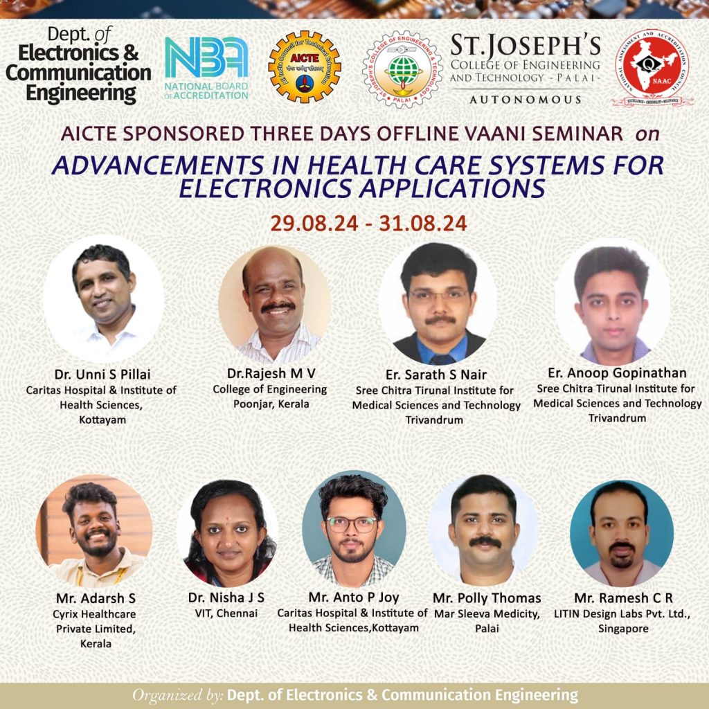 “ആരോഗ്യപരിപാലനരംഗത്തെ ആപ്ളിക്കേഷനുകൾക്കായുള്ള ഇലക്ട്രോണിക് സിസ്റ്റങ്ങളിലെ പുരോഗതി” എന്ന വിഷയത്തിൽ സംഘടിപ്പിക്കുന്ന ത്രിദിന ശില്പശാല 2024 ആഗസ്റ്റ് 29 മുതൽ 31 വരെ കോളേജ് ക്യാമ്പസ്സിൽ വച്ചു നടത്തപ്പെടുകയാണ് .   ദേശീയ-അന്തർദേശീയ തലത്തിലുള്ള മുഖ്യധാരാ വിദ്യാഭ്യാസ സ്ഥാപനങ്ങളിലെയും കമ്പനികളിലെയും പ്രമുഖർ  വിവിധ ക്ലാസ്സുകൾക്ക് നേതൃത്വം നൽകുന്നു .