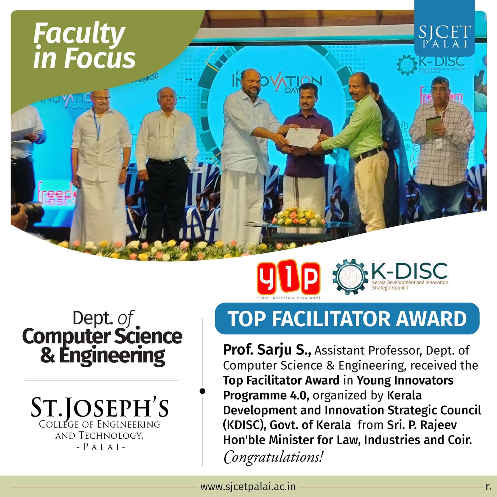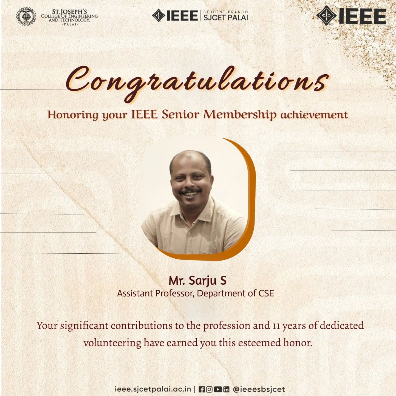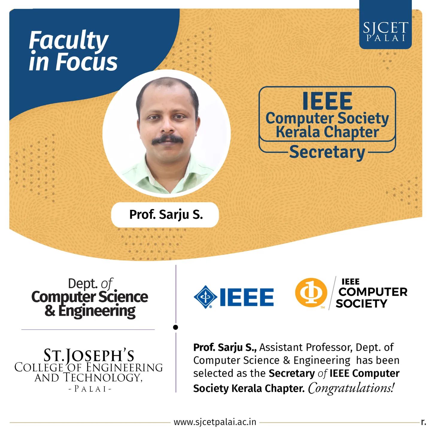 Congratulations to Prof. Sarju S on being elected as the Vice Chair of the IEEE Computer Society Kerala Chapter, the largest society chapter of the IEEE Kerala Section with 4,500 members!