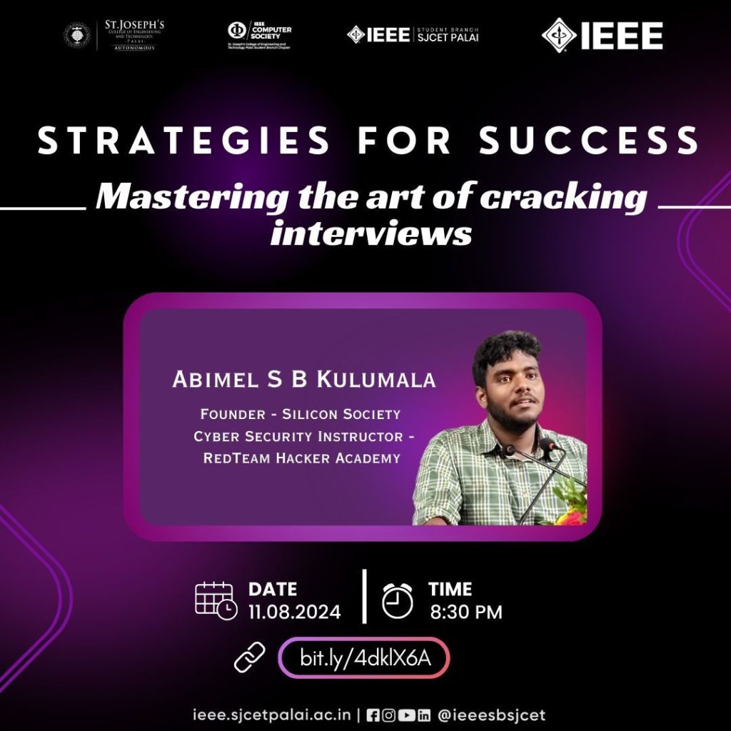IEEE CS SBC SJCET conducted a mentoring session on the topic “Mastering the Art of Cracking Interviews:Strategies for Success” on August 11th,2024. It was conducted from 8:30 pm to 9:30 pm on google meet. The session was handled by Mr, Abimel S Kulumala,founder of Silicon Society,Cyber Security Instructor-Redteam Hacker Academy. It was an informative and useful session.