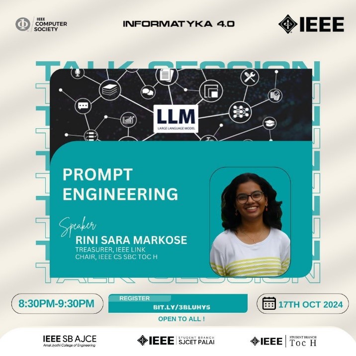 On 17th October 2024, IEEE SBC CS SJCET hosted an insightful online session titled Prompt Engineering, featuring Ms. Rini Sara Markose, a distinguished expert in Natural Language Processing (NLP) and AI systems. With her extensive knowledge in the field, Ms. Markose delved into the intricacies of prompt engineering, offering valuable insights into its applications and impact on modern AI-driven technologies. The session provided participants with a deeper understanding of how prompt engineering plays a pivotal role in enhancing the efficiency and accuracy of AI models.