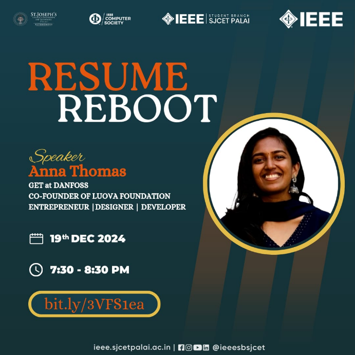 On December 19th, 2024, IEEE CS SBC hosted an engaging one-hour online session titled Resume Reboot, presented by Anna Thomas, a distinguished educator, junior consultant at Danfoss, and entrepreneur. During the session, Anna shared her expertise on crafting impactful resumes, offering valuable tips and insights into how students and professionals can effectively showcase their skills and experiences to stand out in today’s competitive job market. Participants gained practical knowledge on structuring resumes, highlighting key achievements, and tailoring their profiles to make a lasting impression on potential employers.
