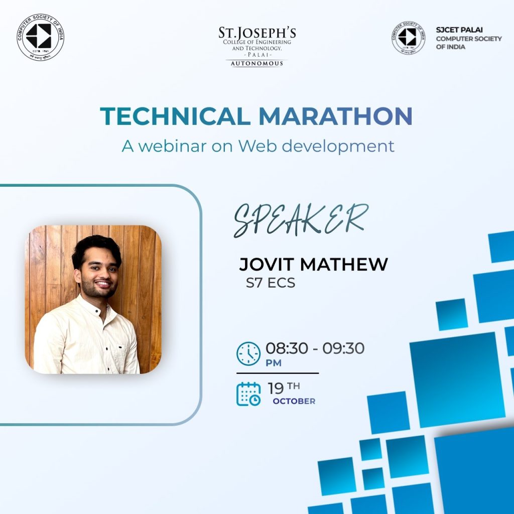 The CSI SJCET Chapter proudly launched its innovative and inspiring new initiative, Technical Marathon, designed to empower students with cutting-edge knowledge and practical skills across various domains of technology. This flagship series aims to foster a culture of continuous learning and technical excellence, addressing the ever-evolving trends in the tech industry. The inaugural session of the Technical Marathon kicked off with a webinar on Web Development, offering participants an opportunity to explore the latest tools, techniques, and best practices in the field. With its promise of delivering a series of power-packed sessions, this initiative is set to become a cornerstone for skill enhancement and professional growth among students.