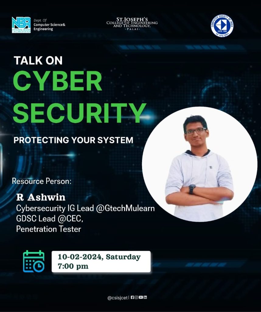The CSI student chapter recently organized an online talk on Cyber Security, which took place on February 10, 2024. The event featured R Ashwin, Cyber Security Lead at GtechMulearn, as the resource person. Despite being conducted virtually, the talk drew an impressive attendance of around 50 students. Ashwin’s insights and expertise surely provided valuable knowledge to all attendees, enhancing their understanding of the critical field of Cyber Security.