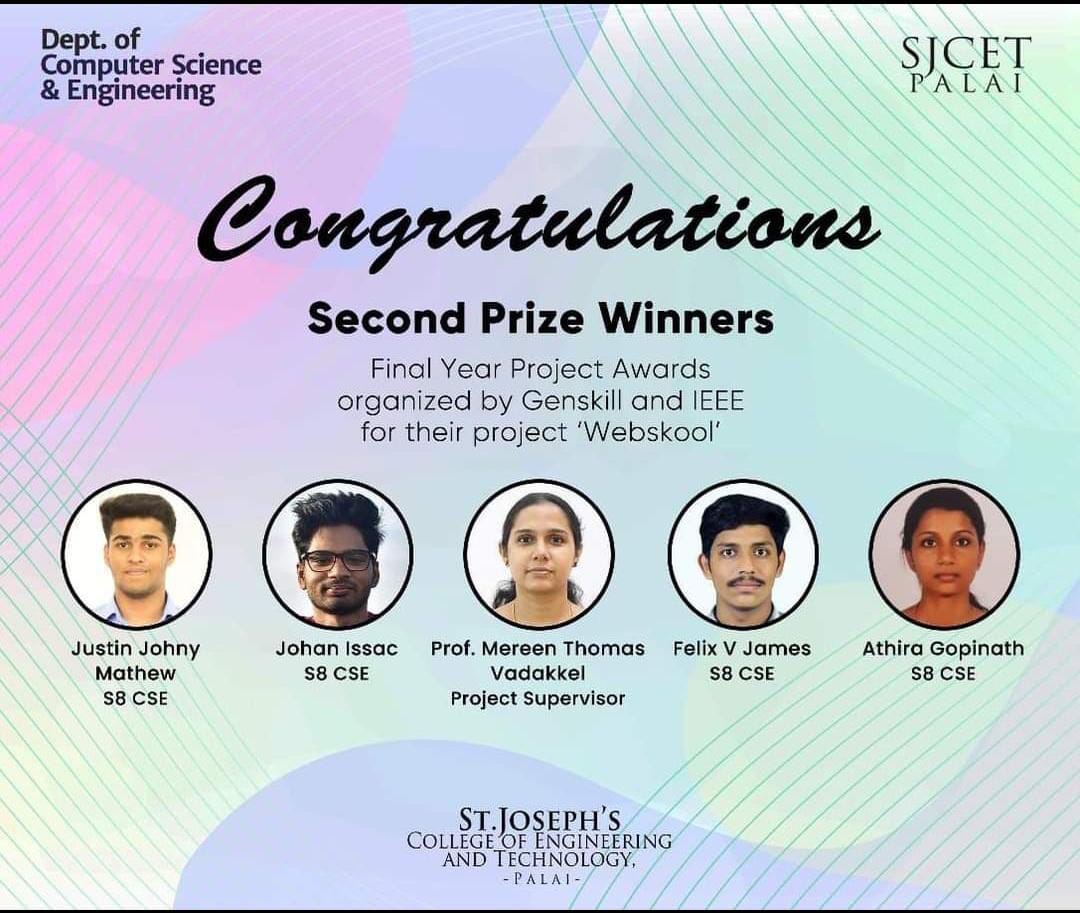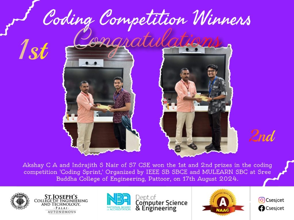Joswin Emmanuel and Danny M Paul of S8 CSE got second prize in BREAK THE QUERY competition, held as part of Nakshatra 25 at Saintgits College of Engineering.