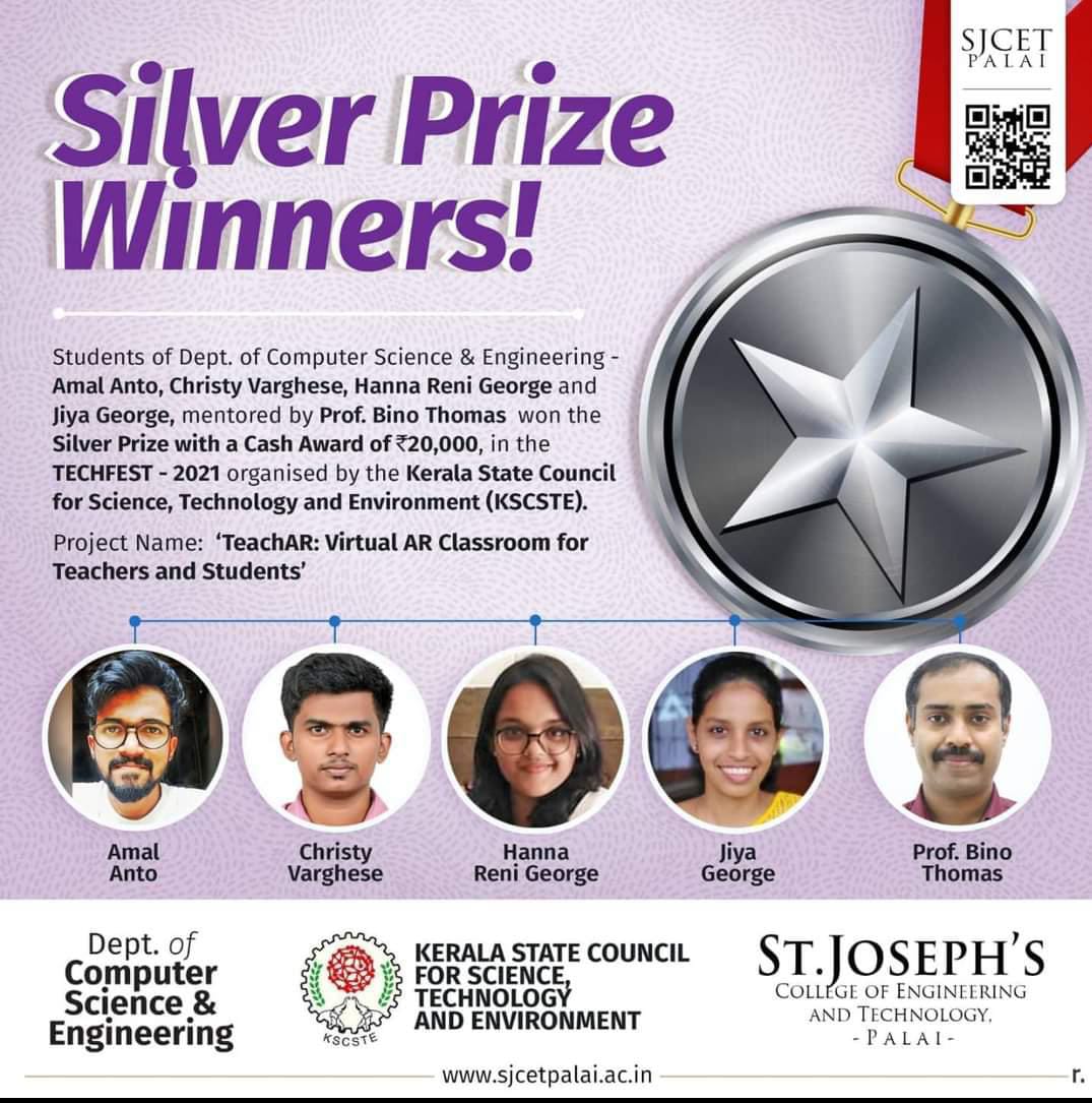 Project Name: TeachAR: “Virtual AR Classroom for Teachers and Students” Won Silver Prize with an award of Rs 20,000 in the TECHFEST-2021 organized by KSCSTE, Kerala.