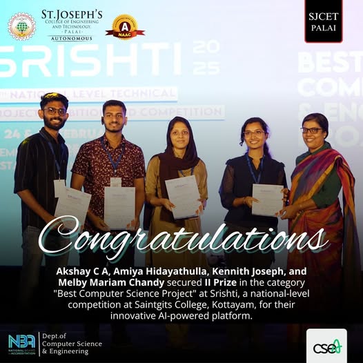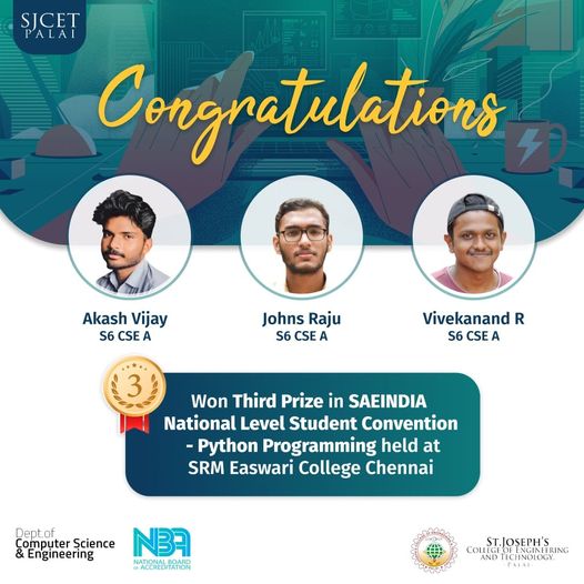 Congratulations to Reon Saji, Praveen KS and Sandeep Salmon- S6 CSE who won Best Computer Science Engineering Project at Srishti – 2019, National Level Technical Competition organized by SAINTGITS College of Engineering.
