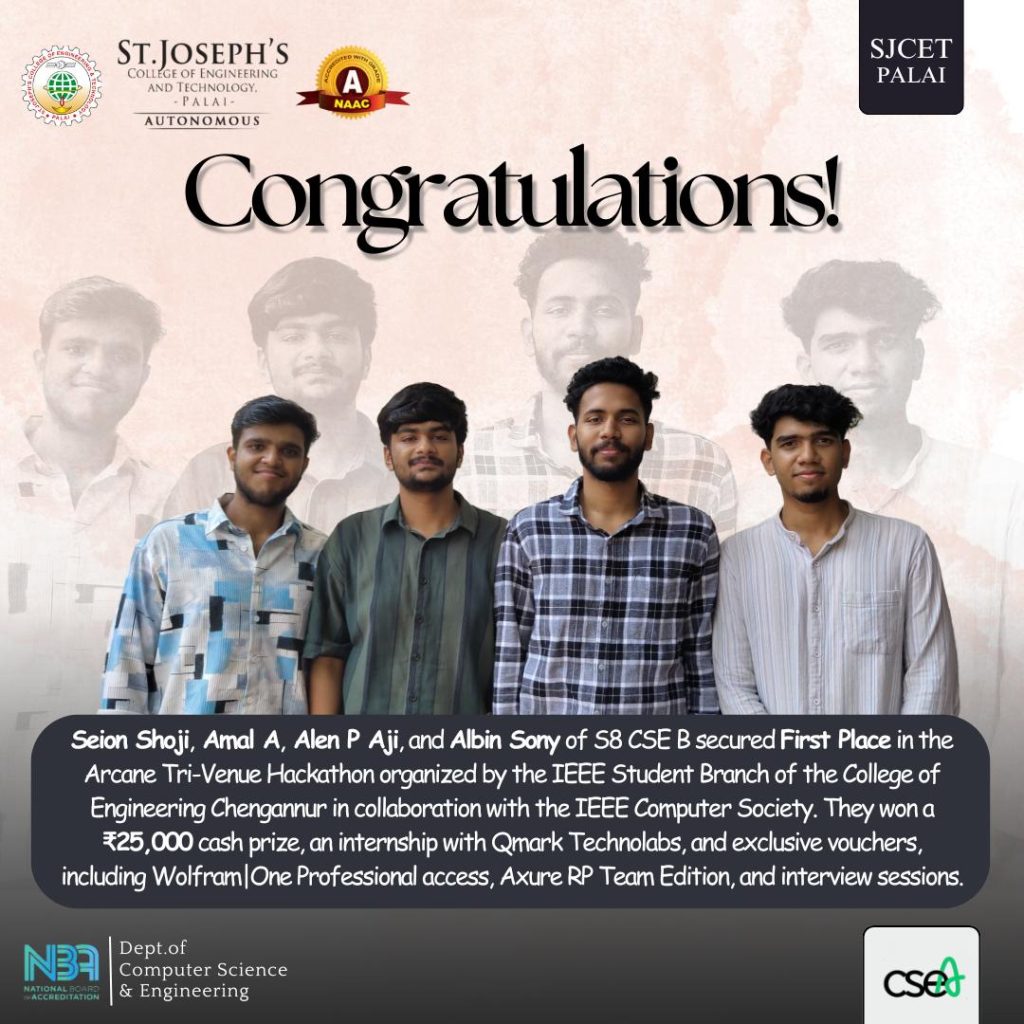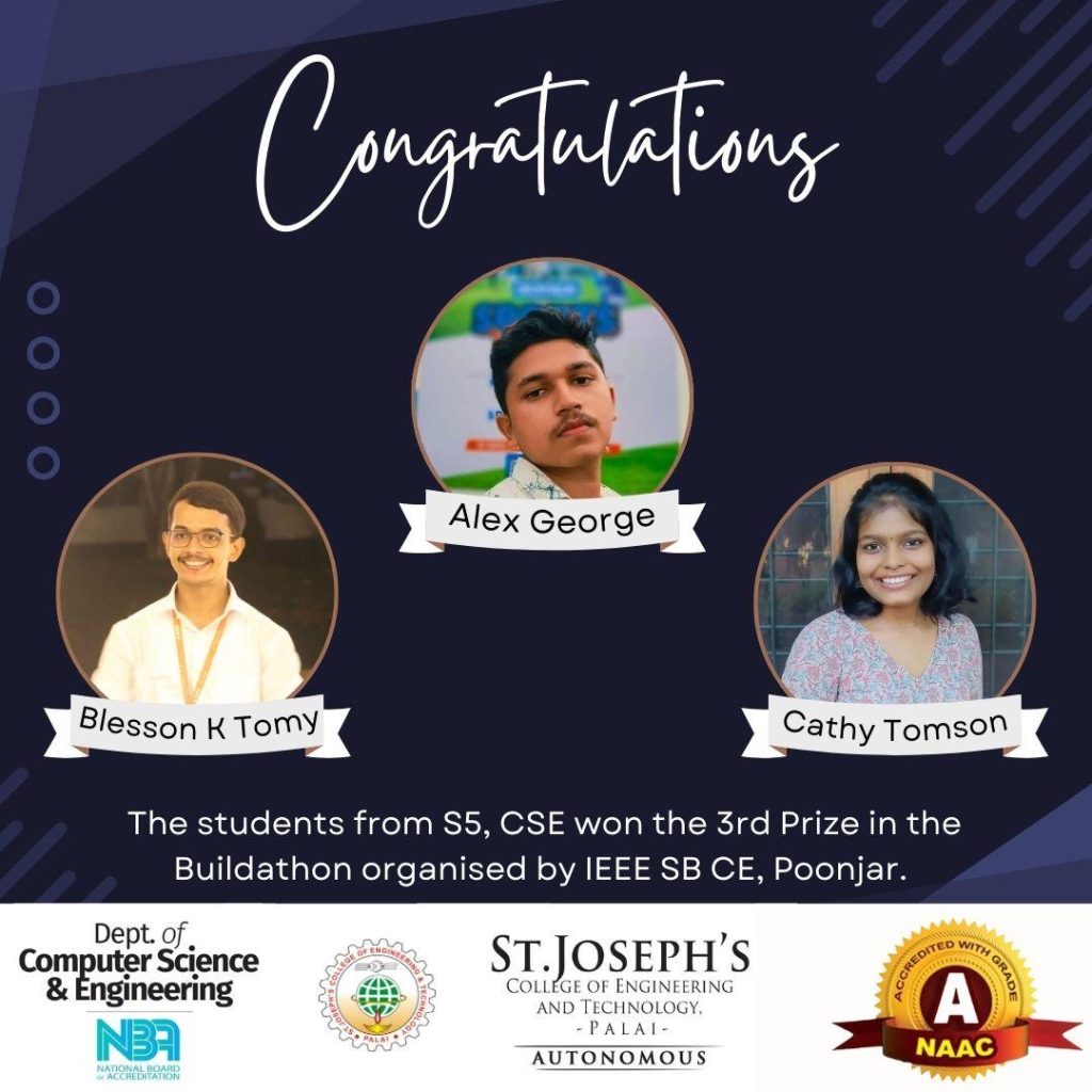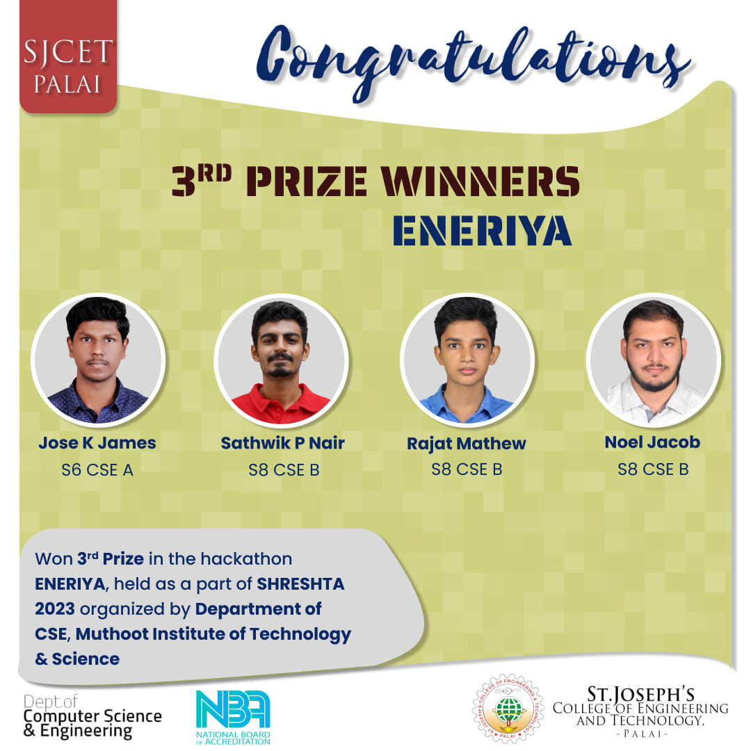Hearty Congratulations dear Reenphy George S8 CSE, Allen Saji S8 CSE, Rajat Sander S6 AD, and Milan Suman S4 CT for winning the second prize and a cash award 25k at the Satwa National Level Hackathon organized by Saintgits College of Engineering, Pathamuttom!