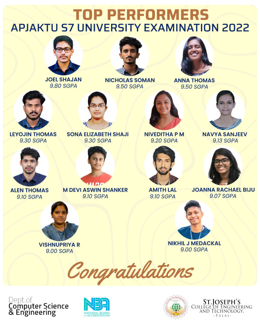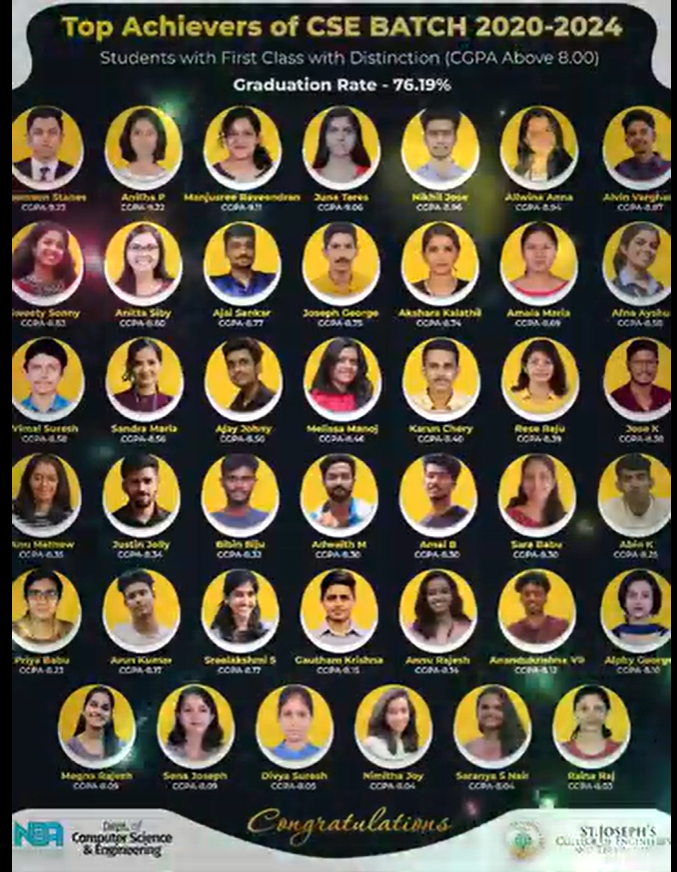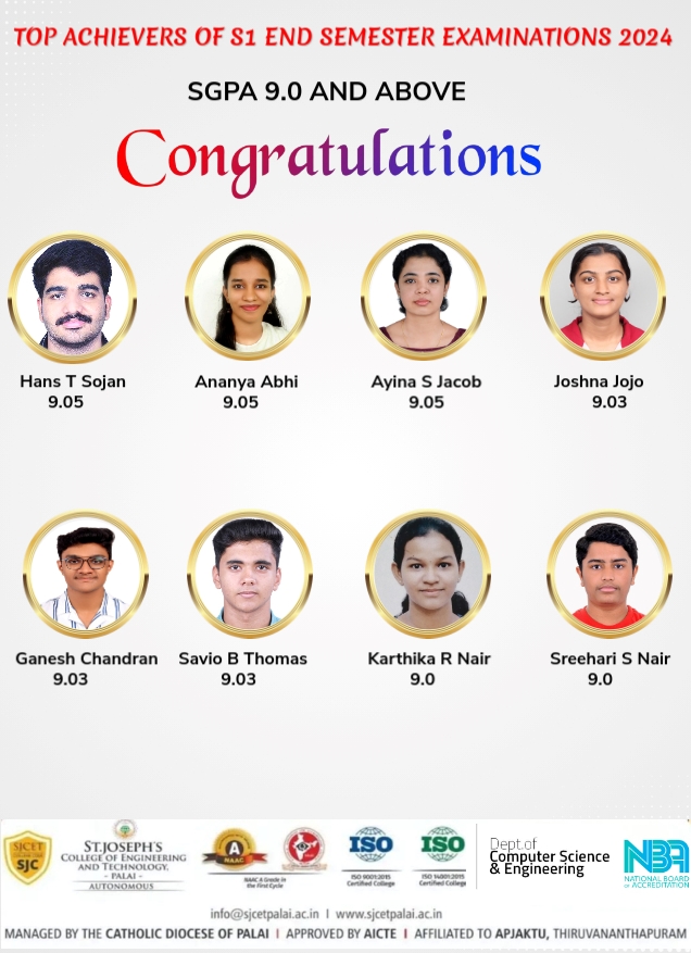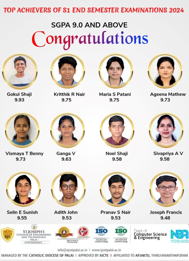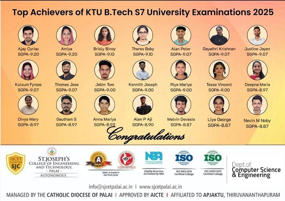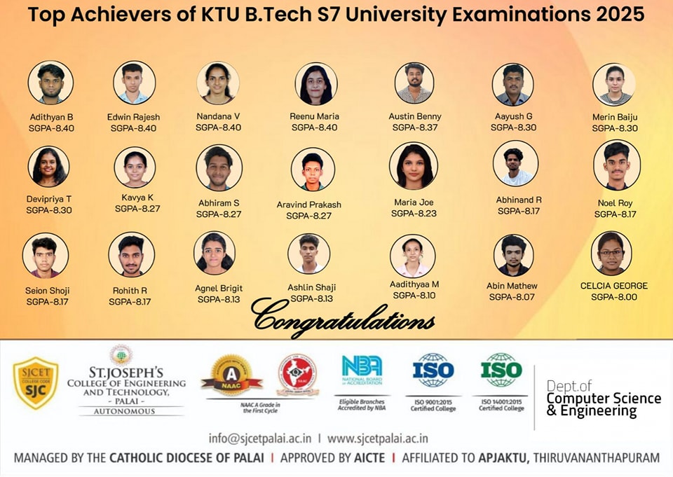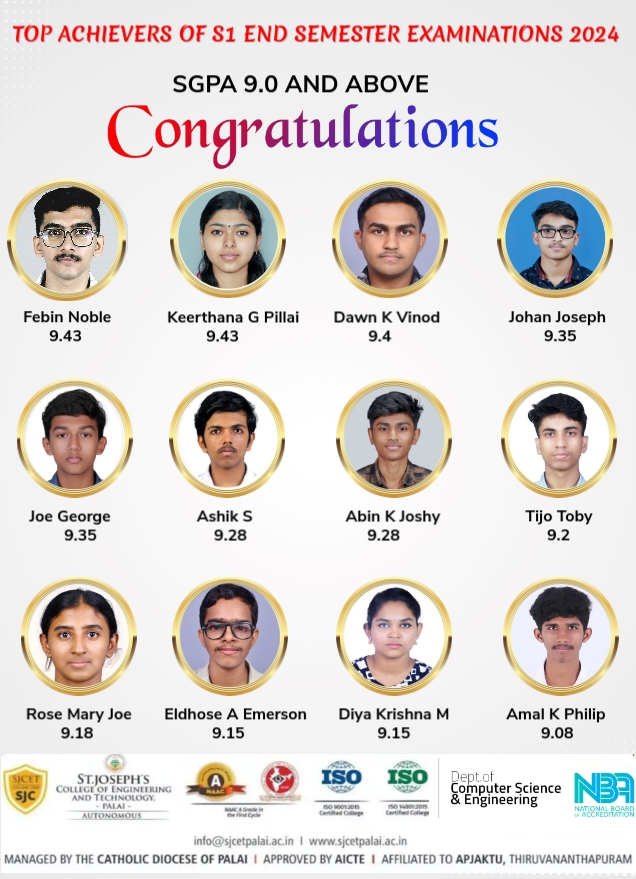 Striking the delicate balance between theory and practice, the Computer Science and Engineering Department of St. Joseph’s College of Engineering and Technology Palai provides a well-rounded education through innovative methods to meet the needs of our students. Computer Science and Engineering Department has a unique blend of faculty and facilities that offers students a rare opportunity to do research and learn Computer Science in new collaborative ways.