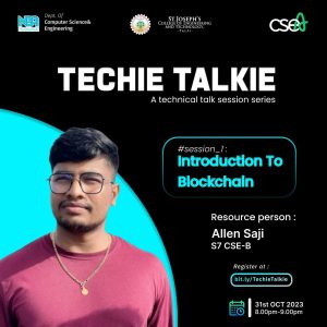 The Computer Science Engineering Association of St. Joseph’s College of Engineering and Technology, Palai, successfully hosted the inaugural session of TECHIE TALKIE on October 31, 2023. The session focused on “Introduction to Blockchain” and featured Allen Saji, a student member of CSEA, as the speaker. The event took place from 8:00 pm to 9:00 pm. Allen Saji delivered an insightful talk, providing attendees with a comprehensive understanding of  blockchain technology. Participants gained valuable insights into the fundamentals of blockchain and its potential applications. The session received positive feedback from the audience, marking a promising start for future TECHIE TALKIE events.