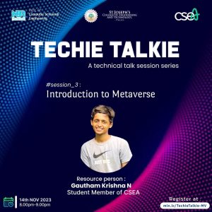 The Computer Science Engineering Association of St. Joseph’s College of Engineering and Technology, Palai, successfully conducted the third session of its TECHIE TALKIE series on November 14, 2023. The session titled “Introduction to Metaverse” explored the immersive virtual realm where digital and physical worlds intersect. Gautham Krishna N, a student member of CSEA, served as the speaker, guiding attendees through the potential of the metaverse for exploration, creativity, and interconnected experiences. The event sparked insightful discussions among participants, highlighting the emerging opportunities and challenges within this evolving digital landscape. Overall, the session provided valuable insights into the transformative potential of the metaverse.
