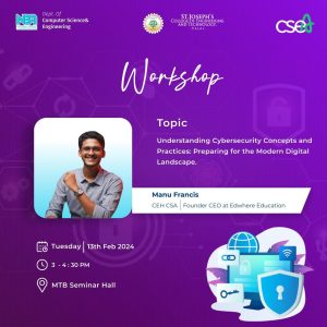 The Computer Science Engineering Association of St. Joseph’s College of Engineering and Technology, Palai, organized a highly anticipated workshop on “Understanding Cybersecurity Concepts and Practices: Preparing for the Modern Digital Landscape” on February 13, 2024. The workshop aimed to equip participants with essential knowledge and skills to navigate the complex cybersecurity challenges in today’s digital era. Mr. Manu Francis, an expert in cybersecurity and Founder CEO at Edwhere Education, served as the speaker. Through engaging discussions and practical insights, attendees gained a deeper understanding of cybersecurity fundamentals and best practices. The workshop successfully empowered participants to tackle cybersecurity threats effectively in the modern digital landscape.