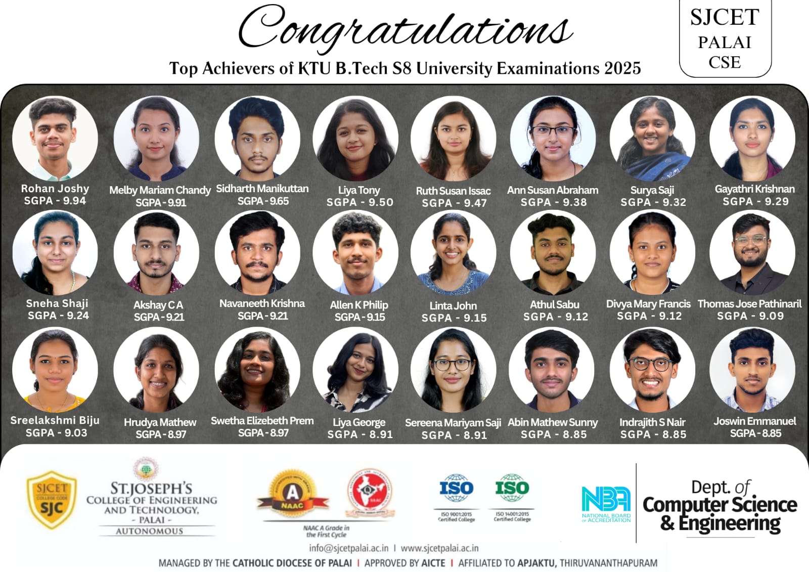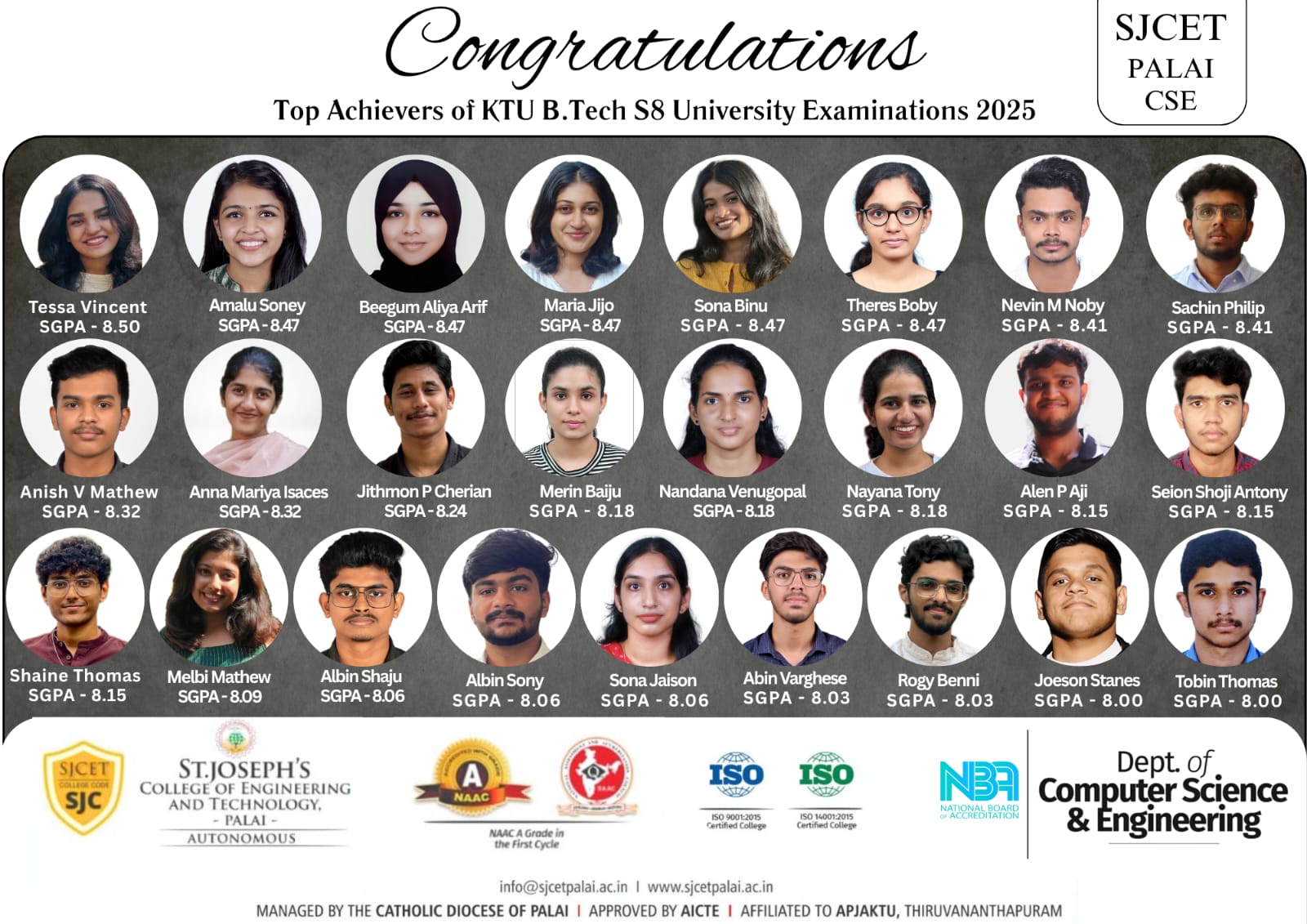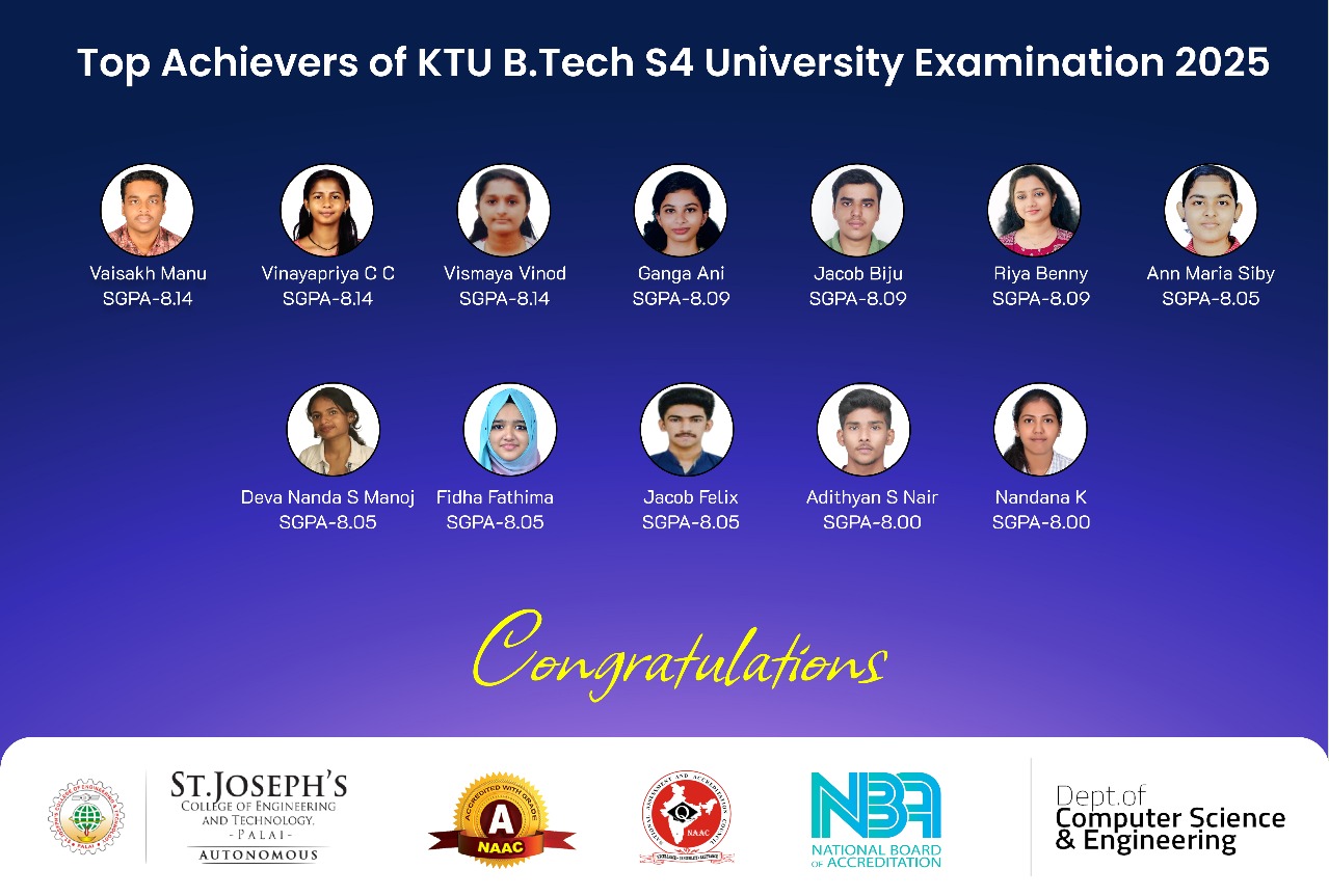 The Department of Computer Science and Engineering was established in the year 2002 and since its inception, the department has progressed with a vision and a strong commitment in developing competent Engineers with uncompromising standards of excellence in training, both through class room sessions and hands on sessions. The Department is equipped with competent and dedicated faculty members who are expertise in the current technologies. The department strives for uplifting the skill of the students to bring out innovative ideas from them with professionalism and ethical values. The department offers BTech (accredited by NBA), MTech and PhD programmes. The department is a recognized research centre of APJ Abdul Kalam Technological University, Thiruvananthapuram. The department has been maintaining an active interaction with the professional bodies like Computer Society of India and IEEE CS.