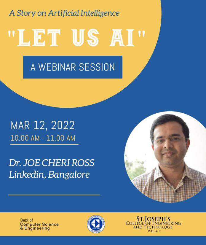 The Department of Computer Science and Engineering of St. Joseph’s College of Engineering and Technology, Palai, in association with the CSI Students chapter, organized a webinar on Let us AI – A Story on Artificial Intelligence on 12th March 2022. The session handler was Dr Joe Cheri Ross, Applied Research Engineer with the Artificial Intelligence team at LinkedIn Bangalore. Around 240 students attended the same event.