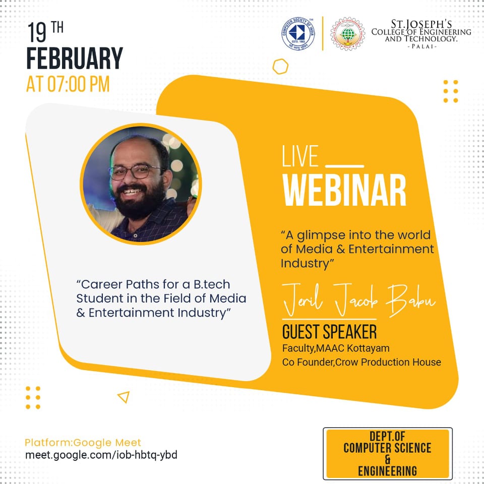 The Department of Computer Science and Engineering of St. Joseph’s College of Engineering and Technology, Palai, in association with the CSI Students chapter, organized a webinar on “A GLIMPSE INTO THE WORLD OF MEDIA AND ENTERTAINMENT INDUSTRY” on 19th February 2022. The session handler was Mr Jeril Jacob Babu, Faculty and Placement Officer at MAAC Kottayam, Co-Founder Crow Production House. Around 60 students attended the same event.