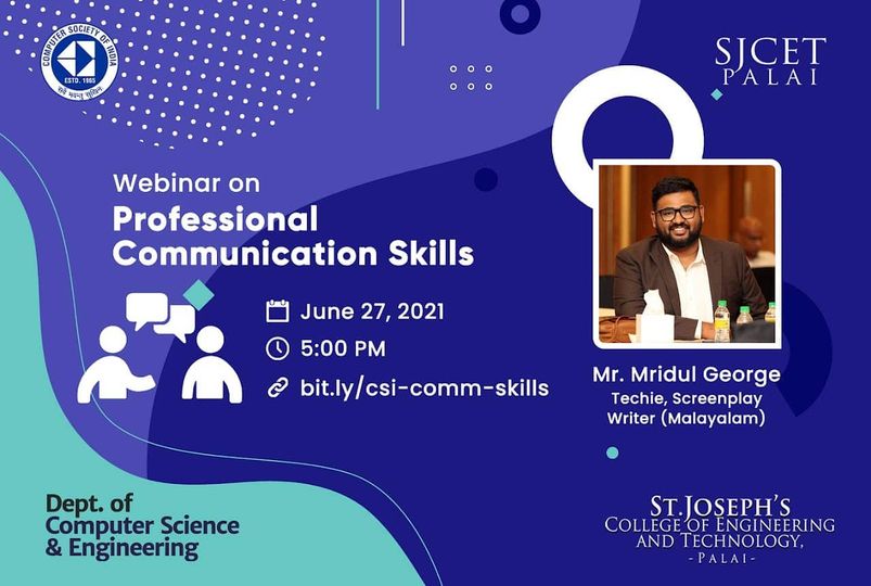 The Department of Computer Science and Engineering of St. Joseph’s College of Engineering and Technology Palai, in association with the Computer Society of India (CSI) Student Chapter of SJCET Palai, organized a Webinar on “Professional Communication Skills” on 27th June 2021. The session handler was Mr Mridul George, Senior Software Developer – Visual IQ / Nielsen. Around 40 students attended the same.