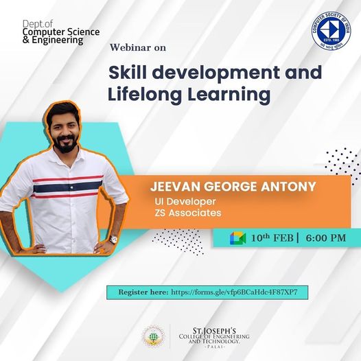 The Department of Computer Science and Engineering of St. Joseph’s College of Engineering and Technology, Palai, in association with the CSI Students chapter, organized a webinar on “SKILL DEVELOPMENT AND LIFE LONG LEARNING” on 10th February 2022. The session handler was Mr Jeevan George Anthony, UI Developer at ZS Associates. Around 40 students attended the same event.
