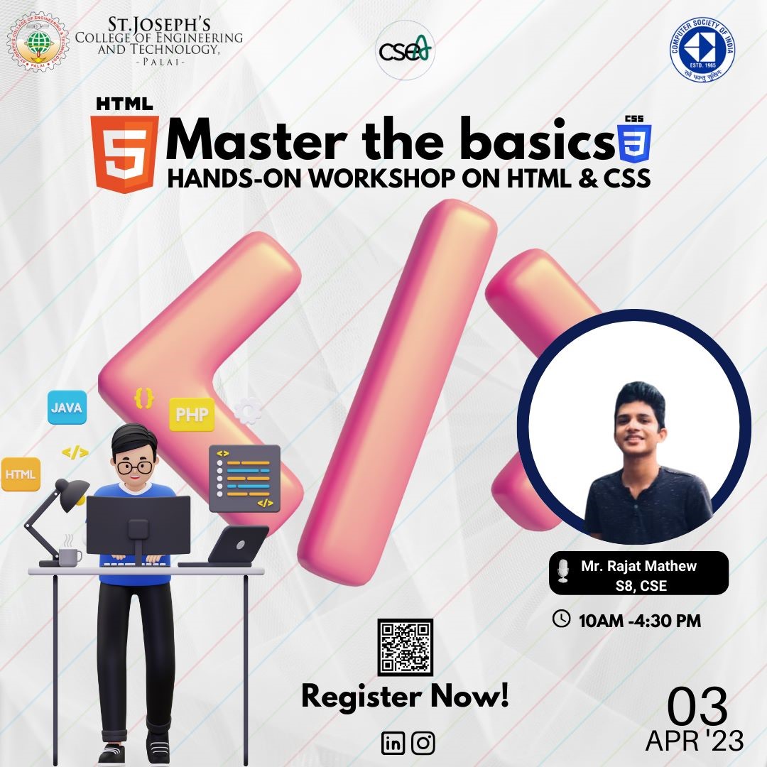 The CSI student chapter of SJCET, Palai, in association with CSEA, conducted a Hands-on workshop on “HTML & CSS Foundations” on 3rd April 2023. The workshop focused on enhancing the knowledge of students in the domain area of building amazing websites and mastering the field of HTML & CSS Foundations. The workshop covered all the fundamentals of HTML & CSS and enhanced the skills of participants in designing a website from scratch. The session was handled by Mr. Rajath Mathew of S8 CSE.