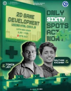The Department of Computer Science and Engineering at St. Joseph’s College of Engineering and Technology Palai, in collaboration with the Computer Society of India (CSI) Student Chapter, recently organized an insightful workshop on 2D game development. Held on 10th and 17th November 2023, the workshop aimed to provide students with a comprehensive understanding of game development using HTML, CSS, and JavaScript. Led by industry experts Gautham Krishna and Tomin Joy of S7 CSE, the workshop attracted over 70 enthusiastic participants from second-year CS, ECS, CY, and AD departments. Through hands-on sessions and expert guidance, students gained valuable insights and practical skills in game development and web technologies, making the event a resounding success.