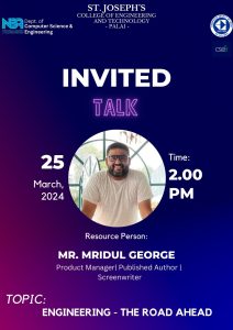 The CSI student chapter recently organized an invited talk on ‘Engineering – The Road Ahead’, which was held on 25th March 2024. The event featured Mr. Mridul George, a renowned professional with a background as a Product Manager, Published Author, and Screenwriter in Mollywood, with past experience at Nielsen and Infosys, as the resource person. Mr. George shared practical tips & tricks for excelling in an engineering career. The event, held at the Seminar Hall, Mother Theresa Block, was attended by more than 210 students, offering valuable insights and guidance to the attendees.