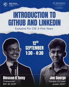 The CSI Student Branch, SJCET Palai organized an exclusive session for S1 CSE A students on GitHub and LinkedIn on 12th September 2025 at the Software Computing Lab.