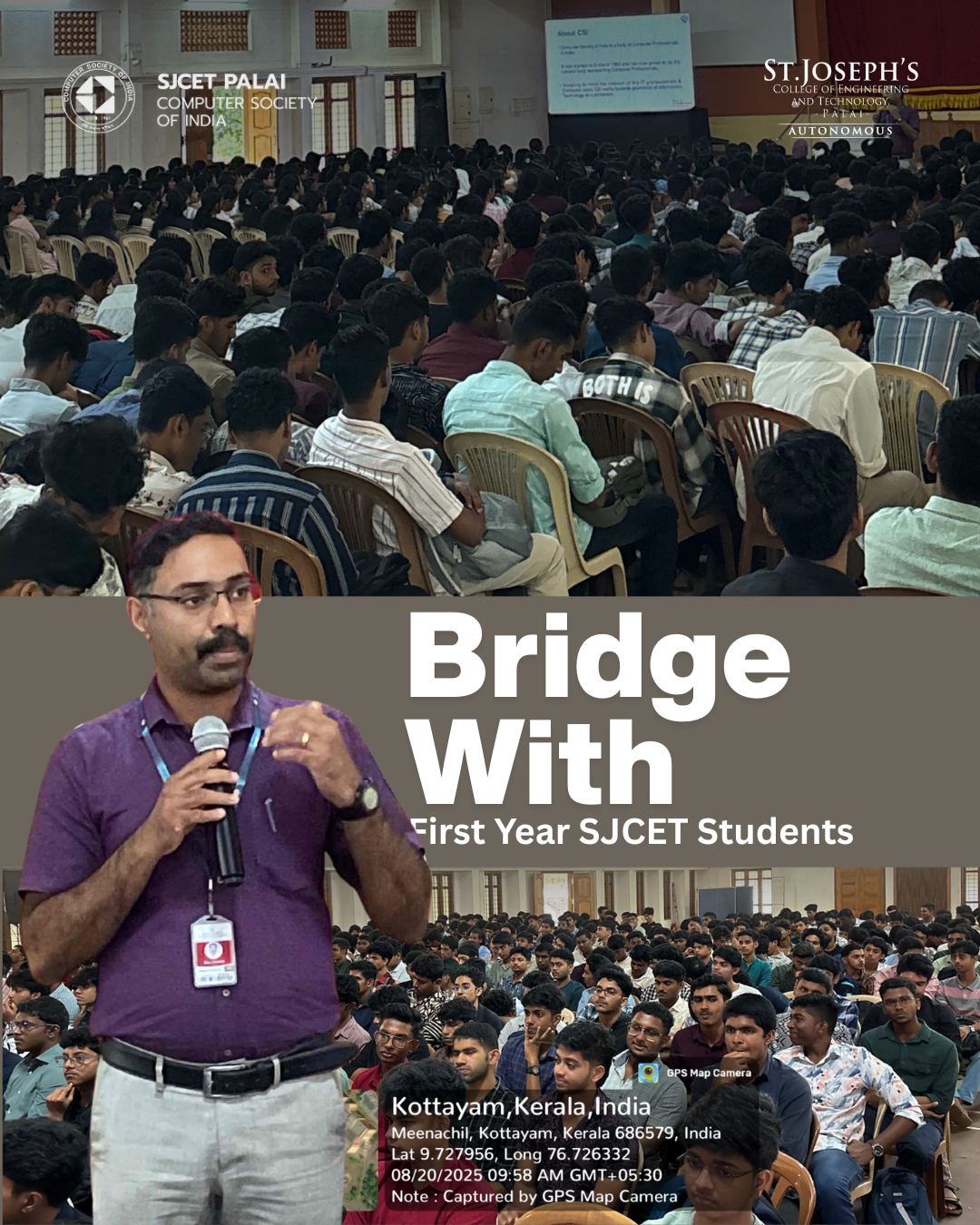 The CSI SJCET Palai Chapter organized an orientation program for first-year students of all CS-aligned branches on 20th August 2025 at St. Joseph’s College of Engineering and Technology, Palai. The session, led by Mr. Bino Thomas (Chapter Advisor) and Mr. Midhun Jomi C (Chairman, CSI SJCET), introduced students to CSI’s vision, activities, and opportunities.