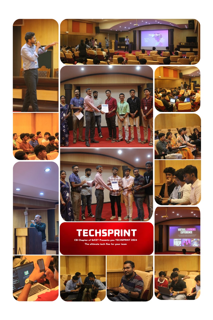 The CSI Community of SJCET, Palai, organized TechSprint on 23rd October 2024 at the MTB Seminar Hall. The day-long event brought together 40 participants who engaged in a series of coding, debugging, and design challenges aimed at testing technical knowledge and creativity.