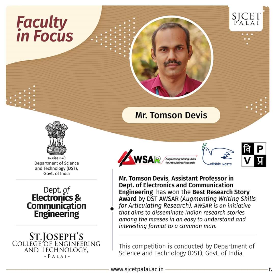 32. Tomson Devis, Assistant Professor received AWSAR (Augmenting Writing Skills for Articulating Research) award 2019 by Department of Science and Technology (DST) Award 2019 for the research story entitled “Can You Hear Me?”.