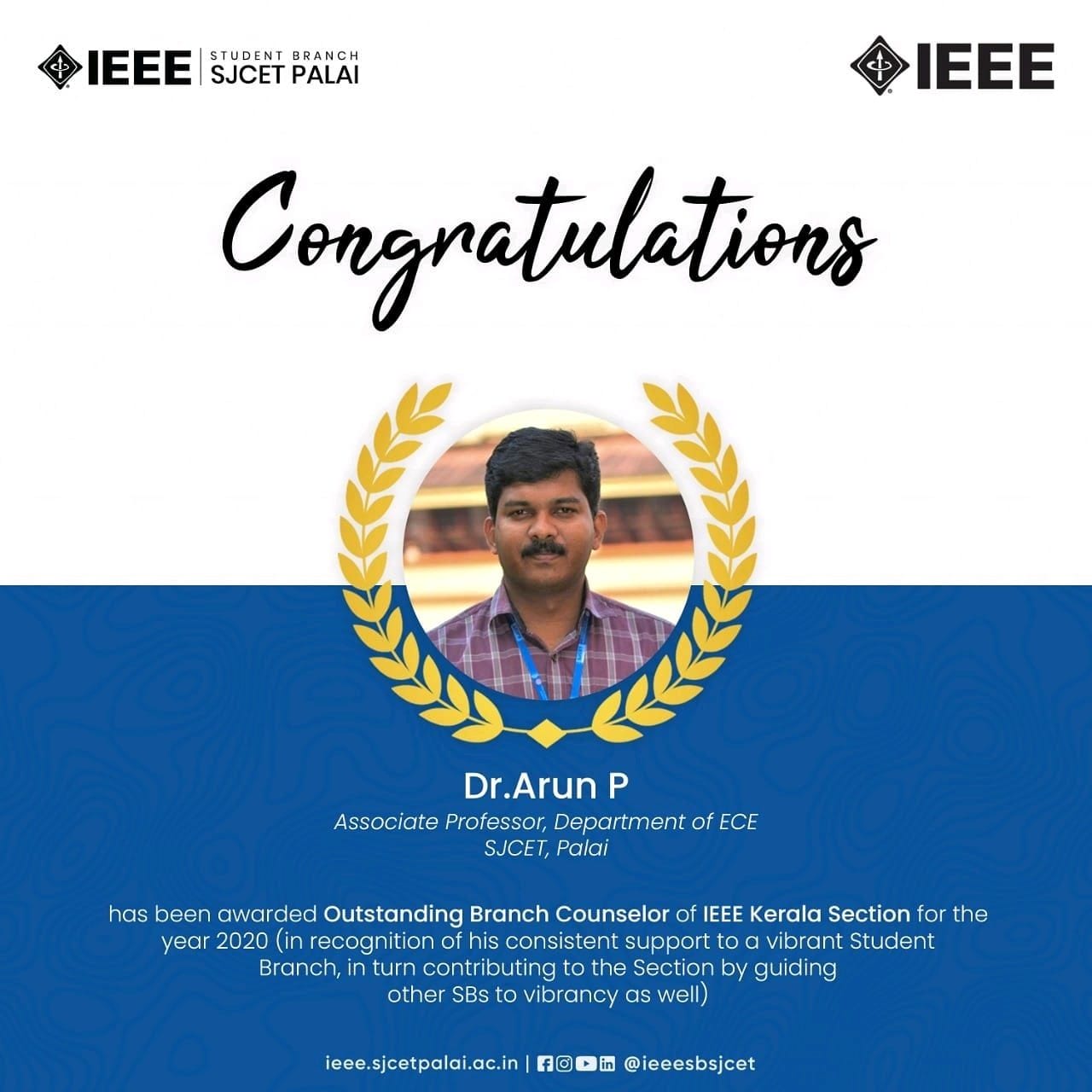 31. Arun. P received the outstanding IEEE student branch counselor award-2020 of IEEE Kochi Sub-section.