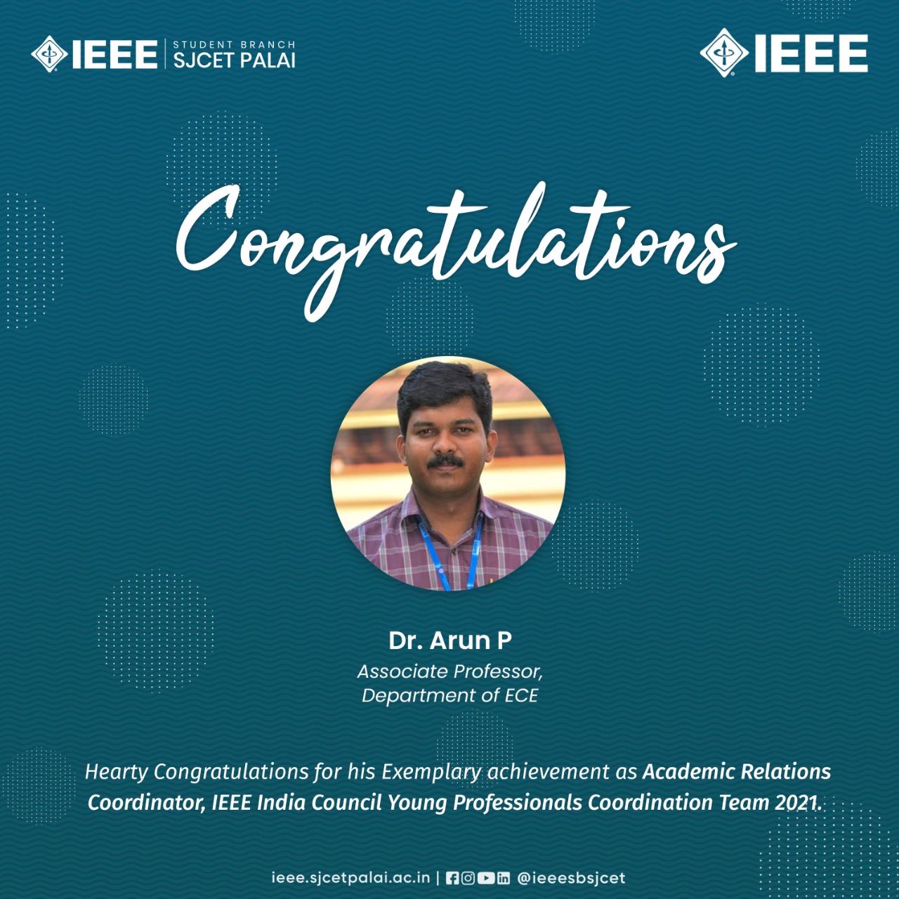 29. Arun.P, nominated and selected as Coordinator, Academic Relations, Young Professionals at IEEE India Council in 2021.