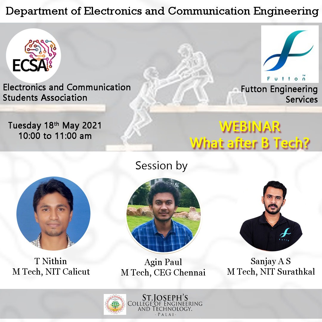• Electronics and Communication Student’s Association (ECSA) of SJCET, Palai organized a webinar on the topic OPPORTUNITIES AFTER ENGINEERING THROUGH GATE/ESE/PSU on February16,2022. The session was handled by Mr. Manimohan Trinath.S of ACE academy.