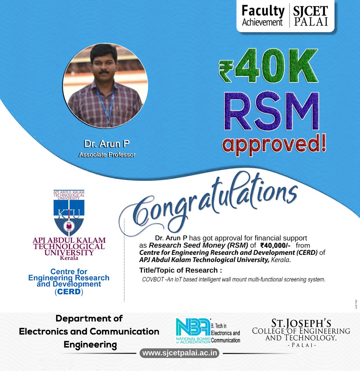 17. Arun. P, Associate Professor has received a research seed money of Rs.40000/- and has been sanctioned by KTU for the project entitled COVBOT -An loT based intelligent wall mount multi- functional screening system on 02/09/2021.