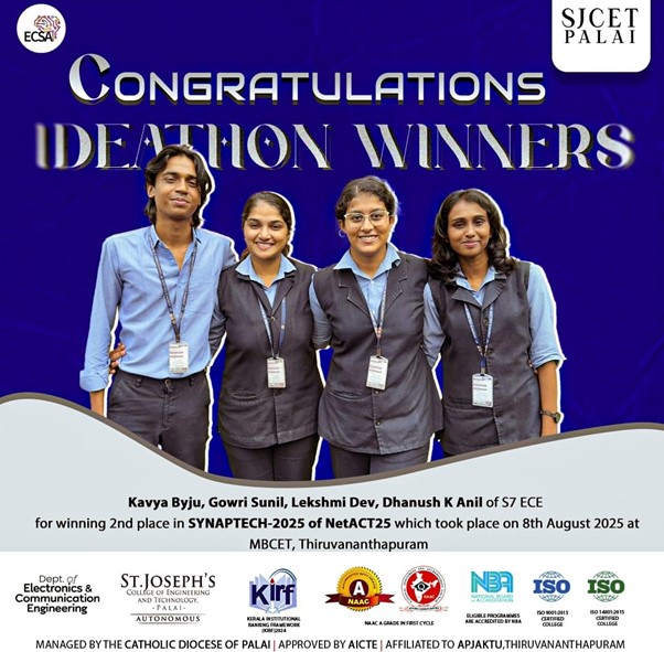 3. Ms. Aleena James, Ms. Jintumol Joseph, Mr. Vishak T A, Ms. Tissa Mary Anil, and Ms. Liz Elizabeth Biju of S6-ECE won second place in the Ideathon competition at APJAKTU techfest-2024, which took place on 16th February 2024 at Ahalia College of Engineering, Palakkad.