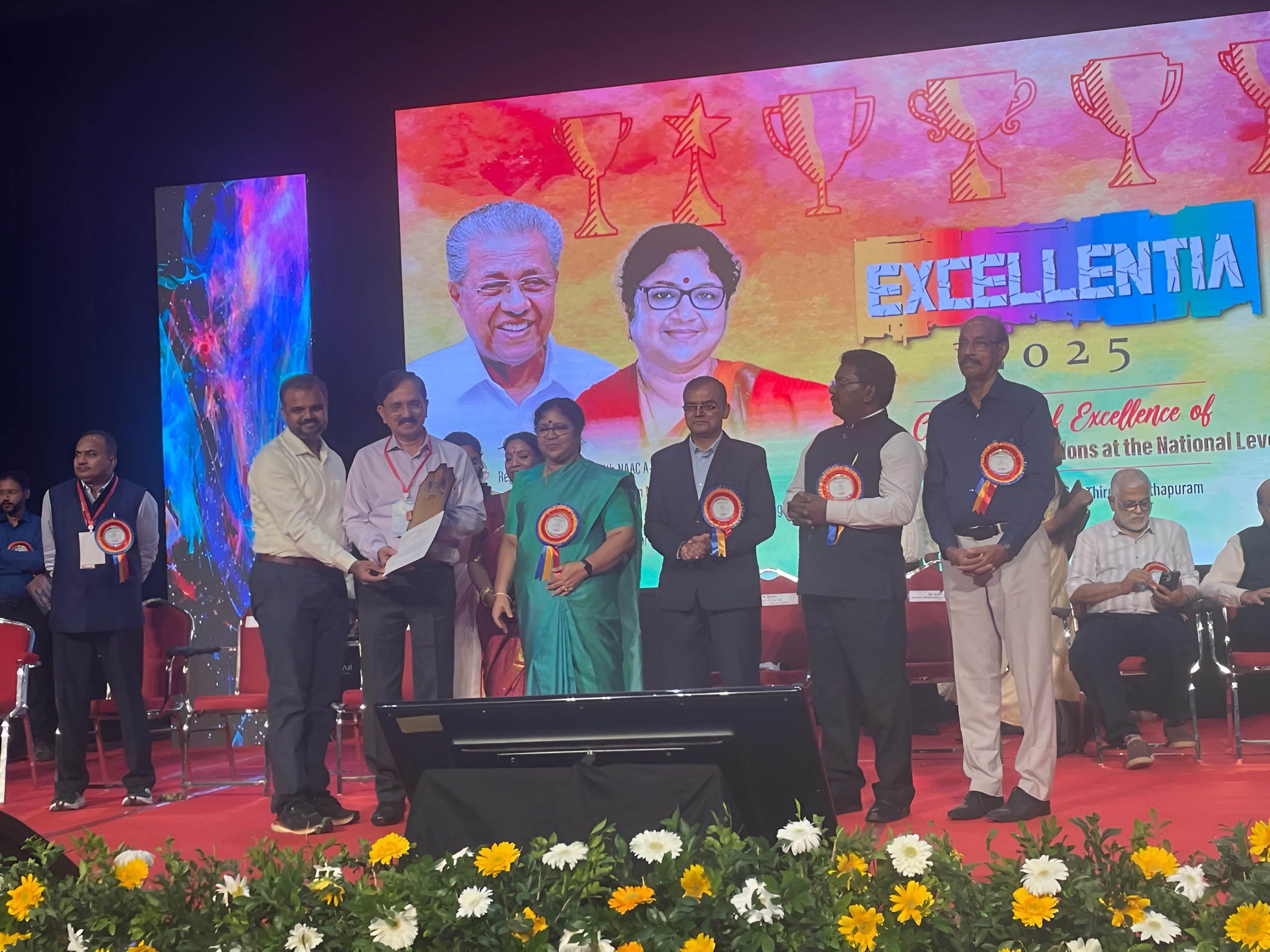 Dr. V P Devassia, principal & IQAC chairman, accompanied by Prof. Sabarinath G. Pillai, IQAC member, receiving the Ministers Excellence Award 2025 from Dr. R Bindu, Minister of Higher Education and Social Justice, Govt. of Kerala, in the honourable presence of NAAC advisor, for achieving NAAC A grade in the very first cycle.