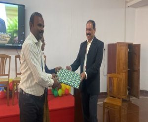 Dr Pious Thomas, Professor and Head MBA receiving gift from Shiv Khera for answering the question “What is the difference between Skill and Competency?”