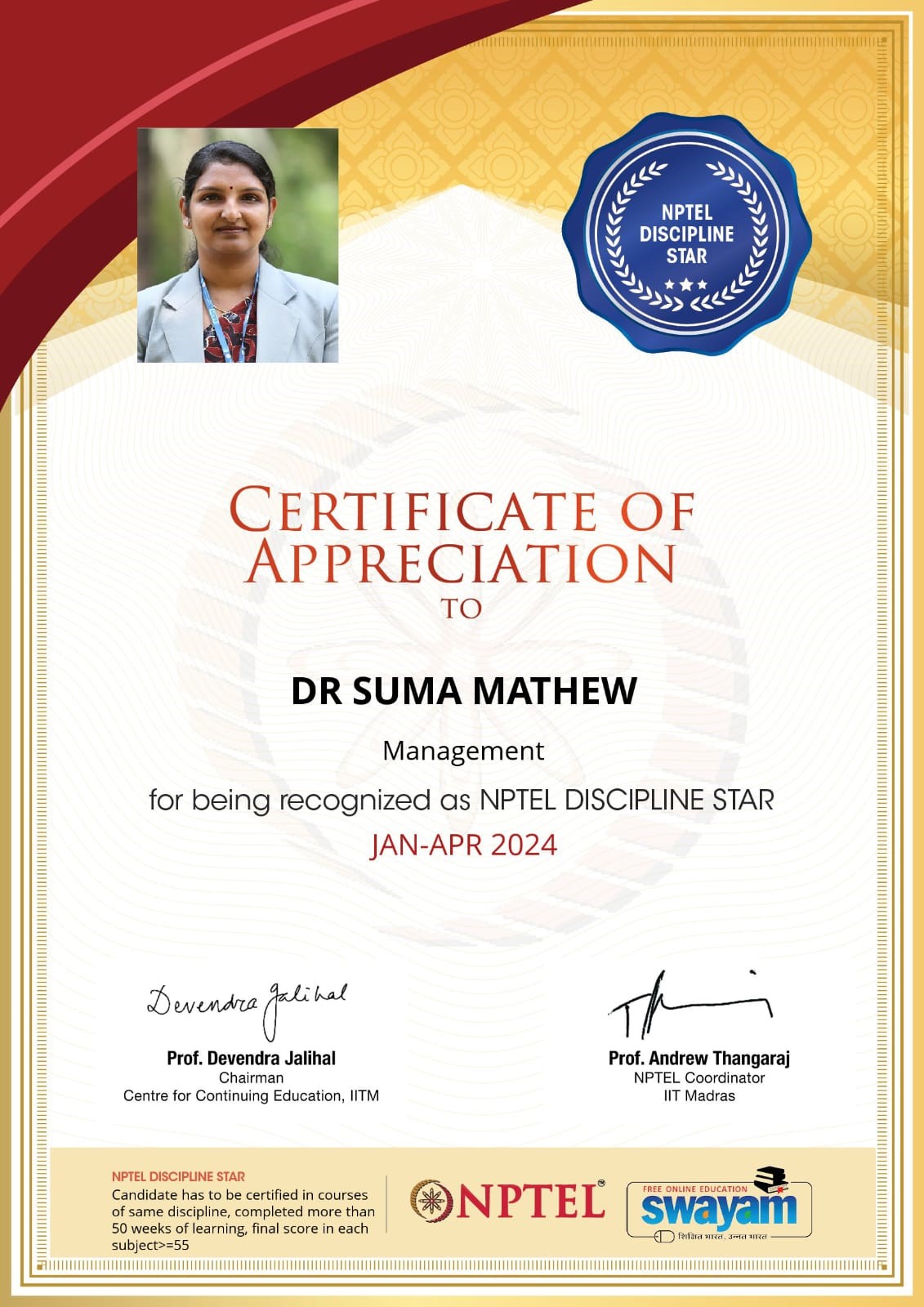 - Ponnu KS & Ms. Anetta Madhumon participated & presented paper on Artificial Intelligence in Digital Marketing influences Consumer Behaviour in the International Virtual Conference organised by Nehru College of Engineering and Research Centre, Thrissur held on 30th November 2023.