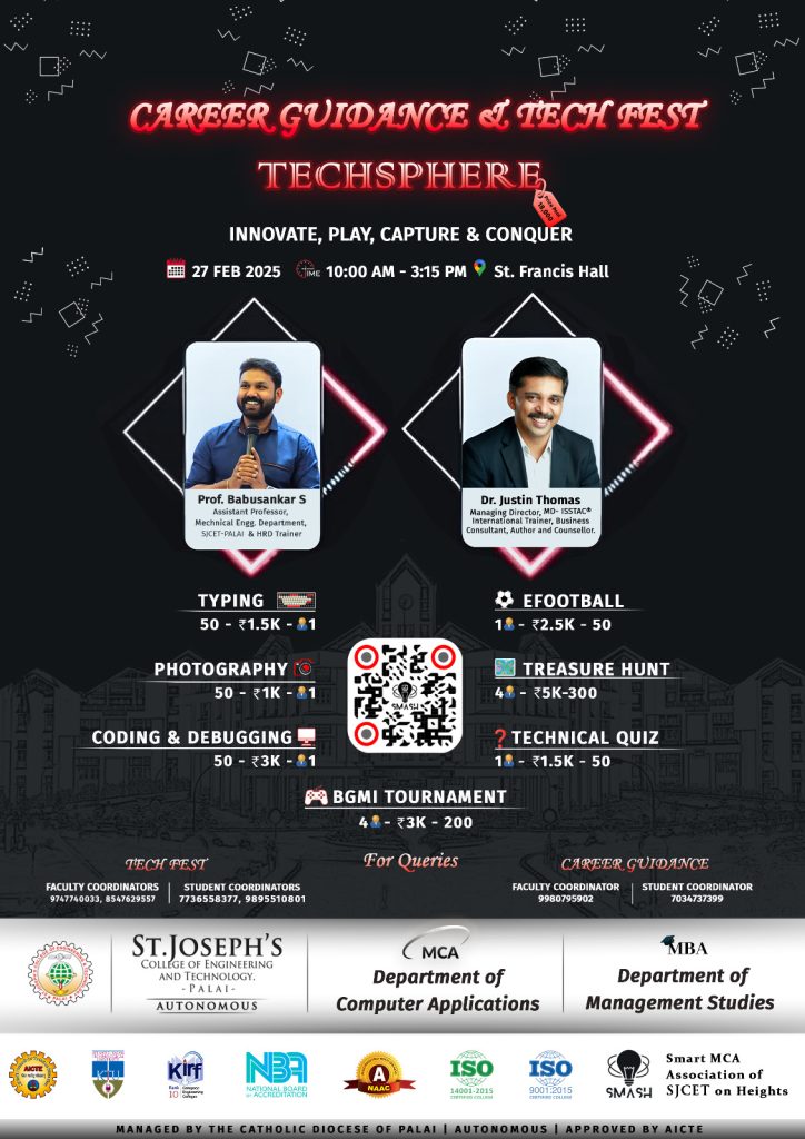 Techsphere 2025: Ignite Your Future! The Department of Computer Applications and Department of Management Studies at SJCET proudly hosted “Techsphere” – a dynamic Career Guidance & Tech Fest on 27th February 2025.