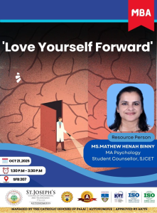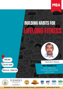 An expert session on the topic “Navigating Growth: Keys to Personal and Professional Transformation” was conducted by Dr. Soumya Varghese, Associate Professor, Department of MBA, Saint Joseph’s College of Engineering and Technology (SJCET), Palai, on 29th July 2025. The session was organized for the first-semester MBA students of Jai Bharath Arts and Science College, Ernakulam, as part of their induction program.