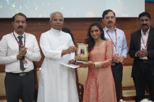 Ms Elba Rose James receiving the Finance Topper Award (2022–24) from Very rev. Msgr. Dr. Joseph Thadathil, in loving memory of Mr. Jossy Babu (MBA 2010–12 batch), contributed by Alumni.