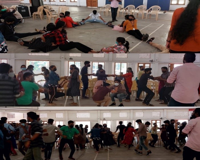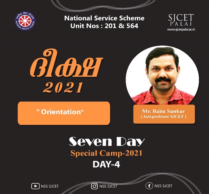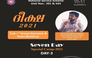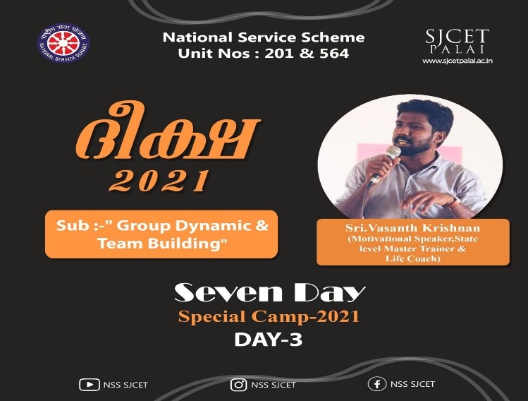 From Day 3 onwards camp was conducted in offline mode at SJCET , Palai. The Third day of NSS special camp 2021 began with the assembly at 9.00 am. The assembly was conducted by Programme Committee. A yoga session was also included for the students during the assembly. Program officer Anto Manual sir and volunteer secretaries gave instructions for the day after the assembly. Each group were given duties for the day.After Assembly session by Sri. Vasanth Krishnan (state level master trainer,Motivational Speaker) on Group Dynamics. Session came to an end by 12.30 pm . After lunch break session a treasure hunt game is set for the volunteers .Game came to an end by 3.45 pm. Thereafter refreshment and wind up for the day.