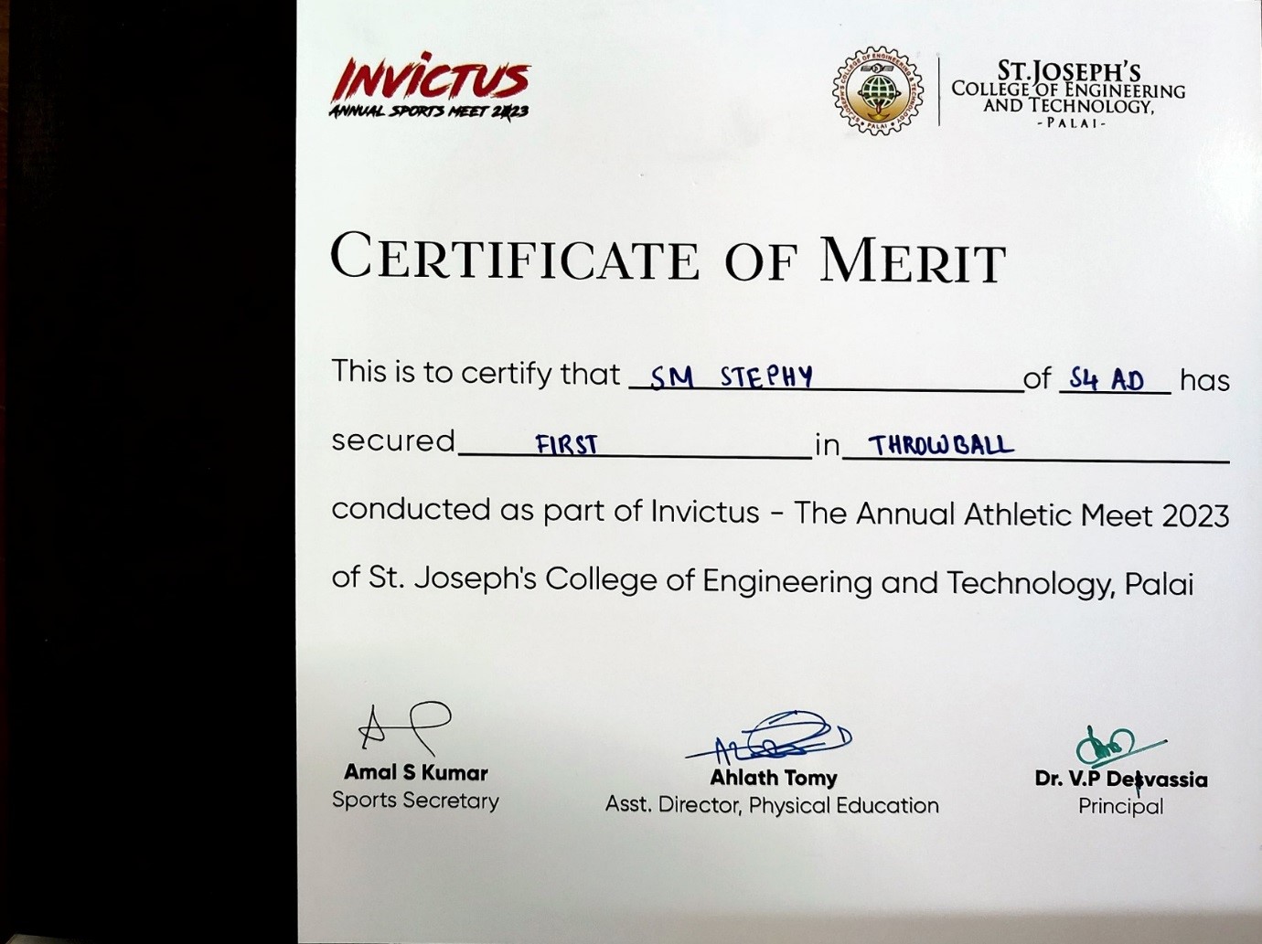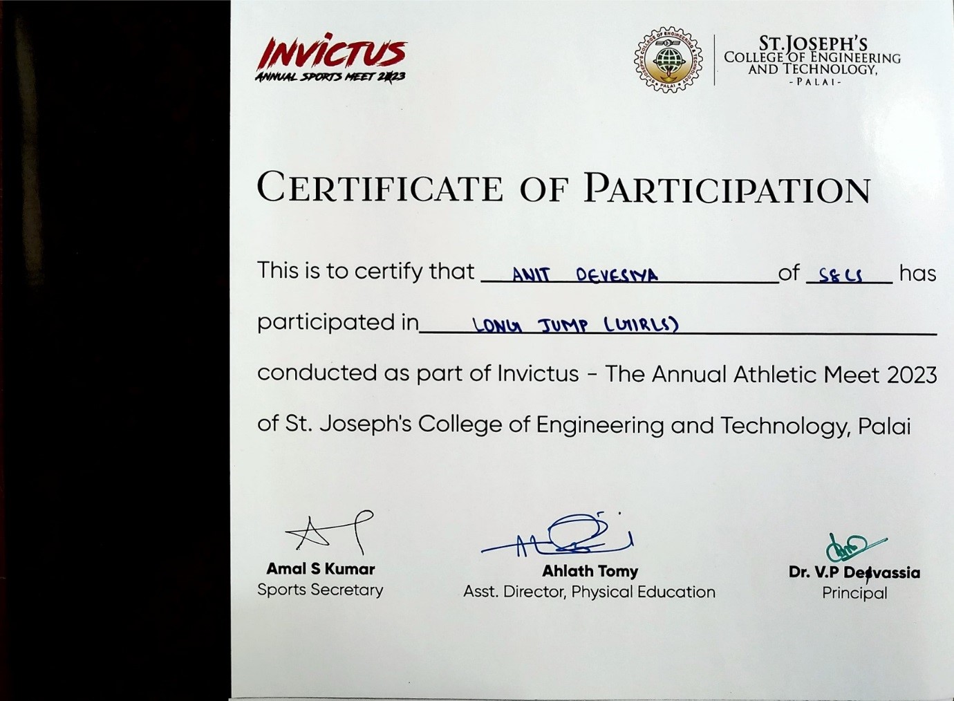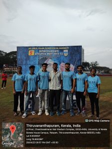 5th Intercollegiate Athletics Meet was conducted at Thiruvanathapuram on 27, 28 & 29 April 2023. Ten (8 boys & 2 girls) students had participated in different events. Indraj S had secured Gold Medal in 110M Hurdle.