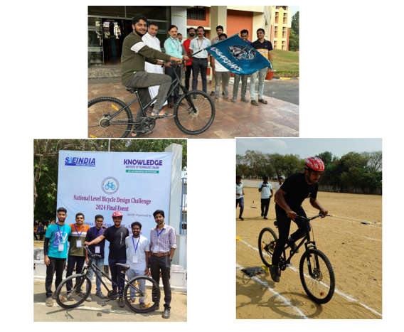 The SAE INDIA southern section society annually conducts the Bicycle Design Competition, where teams design, engineer and prototype a single-seat bicycle from the ground up, for given requirements and within the rules and regulations of the competition. This year, the final phase of the competition was conducted in the first quarter of 2024, on 24th and 25th of February in Tamil Nadu, at Knowledge Institute of Technology, Salem. The initial screening process began from early November 2023, with the evaluation of four technical reports, based on Ideation, Design, Analysis, Cost, and Manufacturing. Mr. Anooplal B. served as the faculty advisor for our team, accompanying us during the offline competition, and Jilse sir was the regional head of the Cochin section and chairman of SAEINDIA from our college, providing necessary help and guidance. The team was led by the captain Benison Benny, and consisted of 5 members: Anson Joy, Emmanuel Sunny, Geo Sunny, and Savio Tomy. A total of more than 60 teams from all over India had registered for the competition. Over 45 teams participated for the initial round, and our team was one out of the 38 teams participating in the final offstage competition held at Tamil Nadu. There were 8 teams who registered from Kerala, and we successfully reached all the way to the final round of the competition. On Day 1, the event was inaugurated at 9:00 AM, and the competition rounds began after all the Bicycles underwent a weight test. The first round was to compete for dis-assembling and assembling the whole cycle with maximum 3 members from each team, within the shortest duration. After successfully completing the assembly-disassembly test, our team proceeded to undertake the U-turn and Slow-Cycle Test, with Savio Tomy driving the cycle and accomplishing the task. Following this, we tackled the Brake Test, which was rode by Geo Sunny, and successfully passed this round as well. Subsequently, our team underwent technical inspection and innovation rounds, marking the conclusion of day one. The following day, we completed the Bump Test and Pedal-Stroke Test, ultimately concluding our participation in the event. By evening, we gathered for the closing ceremony, marking the end of two eventful days of the competition Looking back, we ideated & designed the concept for our cycle, conducted various computational analyses to test our designs, fabricated various components, and learned to work as a team to build and deliver a product within tight deadlines. We successfully completed all the rounds of the competition, and our cycle successfully passed all the physical endurance tests. Throughout the event, we engaged with students and faculty members from various colleges across the country, industry engineers, and other esteemed individuals renowned for their technical expertise. This experience was truly memorable and enriching