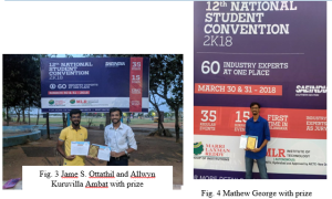 Nine students in various teams has participated in SAE INDIA’s National Student Convention, hosted by MLR Institute of Technology, Hyderabad, Telangana during 30-31 March 2018. Tier-3 competitions were organized along with Student National Convention. One of our team constituting Jame S. Ottathil and Allwyn Kuruvilla Ambat, students of S6 Mechanical Engineering secured First position in the Business Plan presentation. They competed against various colleges and presented their Electric vehicle business plan with a jury including General Manager of Mahindra Electric, Chennai Division. Also Mathew George, student of S6 Mechanical Engineering for securing Third position in CAD drawing.