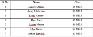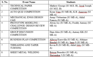 Design & CAD (Ist Prize)                    –          Karthik C Nair (S8 ME B), Nrupan Sateesh (S8 ME B), Ebin Shibu (S6 ME A)