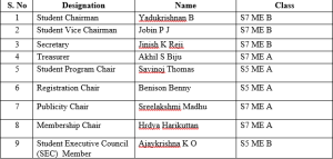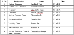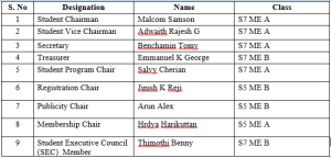 General Body meeting of SAEINDIA collegiate club of SJCET is conducted at 04.30 p.m. in seminar hall of Mechanical Engineering Department. Agenda of meeting is selection of office bearers for the current academic year and discussion on club events. The office-bearers were lected during the meeting and listed is followed in the table: