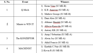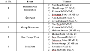 SAEINDIA Collegiate club of SJCET conducted four sets of Tier -1 competitions in intra-collegiate level. The purpose of organizing Tier-1 competitions is to make team selection for Tier-2 competitions organized under Cochin division of SAEINDIA Southern Section at Saintgits College of Engineering, Kottayam. The results of the competitions are: