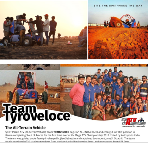 Team Tyroveloce racing of St. Joseph’s College of Engineering & Technology Palai Secured 18th Rank (AIR) Out of 89 teams competed from all over India in MEGA ATV CHAMPIONSHIP Organised by Auto Sports India held at GOA.