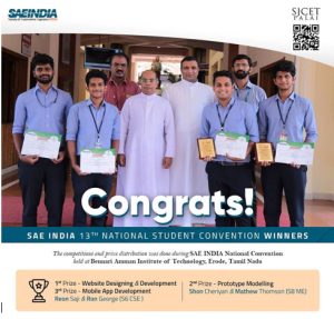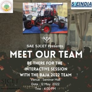 SAEINDIA Collegiate club of SJCET Pala has started in the year 2011 and thriving its operations through the vibrant student members since then. It was registered under southern secion of SAEINDIA and was later counted under Cochin division in 2015. Student members are actively participating in intra collegiate as well as intercollegiate activities organized by SAEINDIA southern section and SAEINDIA collegiate clubs. Student members of this club are actively participating in events like SAE TREK, BAJA, WORKSHOP, STUDENT CONVENTION, SUPRA, CAREER START and various tier events and have achieved notable accolades.
