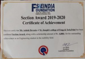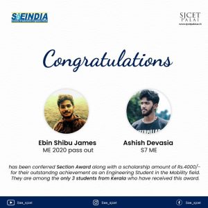 Mr. Ebin Shibu (S8 ME) and Mr. Ashish Devasia Edasseril (S6 ME) have received SAEINDIA Section Foundation award with a cash scholarship of ₹ 4000/- each for the academic year 2019-20. The awards are achieved for their outstanding achievement as Engineering students in field of Mobility.