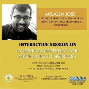 SAEINDIA Collegiate Club of SJCET Palai in association with Mechanical Engineering Association of SJCET Palai organized an interactive session on the title Career Competency for Mechanical Engineers on 11th April 2023 during 11.40 – 01.00 p.m. The targeted audience was SAEINDIA Student members and pre-registered B. Tech Mechanical Engineering students. The session was started with the welcome address by Mr. Albert Saju. Mr. Alvin Salu introduced resource person and the entire session was moderated by Mr. Gibin Sabu. The session started with a few questions by the resource person Mr. Alen Jose about the practical feasibility of fully Electric EV mobility of INDIA as well as the whole world. He made a real time online survey among the students and the discussion were based on the response of the audience.