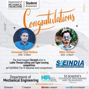 A team consist of Emmanuel Shaji Mathew and Bilbin Mathew (both S6 ME students) bagged second prize in Lathe Thread Cutting & Taper turning competition of SAEINDIA Southern Section (National Competition) held during June 2021 conducted in online mode.